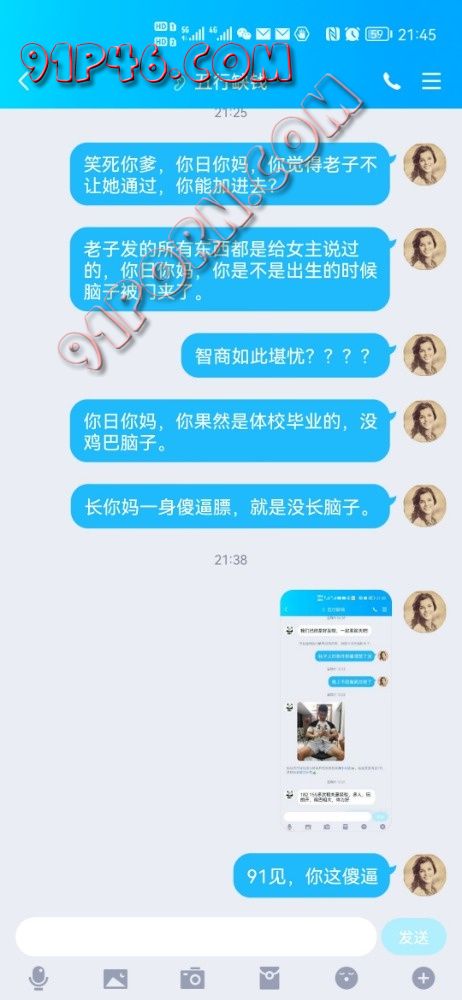这不是他妈的智商堪忧???你加女主,女主会不跟我说??加了以后还他妈的吓女主,说她的照片被发得到处都是。真JB搞笑啊,老子发什么东西肯定都是跟女主说过的,还用得着你截图?爆给大家知道一下,这个傻逼。!!感觉吃屎长大的都比他聪明,不光是智商低,道德还他妈的差。大家注意。