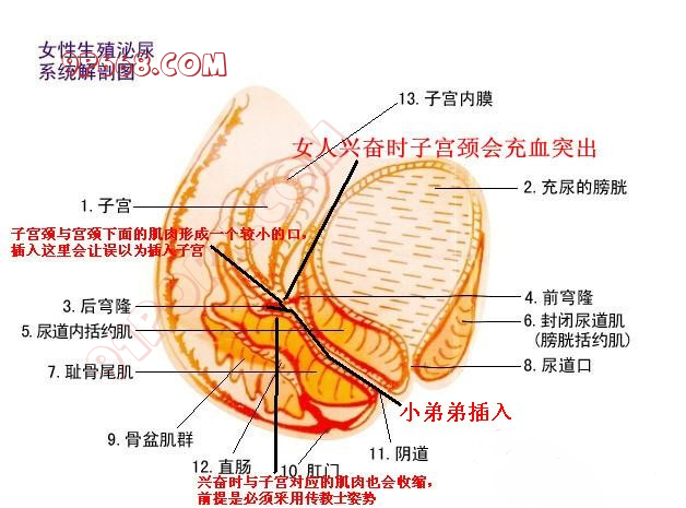 1.看图说花,黑色粗线红色字是我画的,从上往下看,首先几乎大半女人兴奋时候都能宫颈充血并突出,充血突出的子宫颈你用手是可以摸到的,全部中指头进入就能摸到(你的指头短不能怪我哦),你会发现宫颈是一个朝着阴道口方向突出向下延伸的。