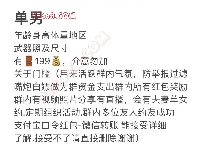 关于门槛:过滤嘴炮白嫖屌丝,作为群资金活跃气氛,群内视频照片分享直播,夫妻单女线下邀约,群内多位成员约友成功 .